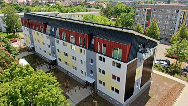 Partial dismantling of entire rows of prefabricated buildings, demolition of individual building sections, reduction of the number of storeys, revitalisation of the remaining buildings, and the creation of attractive, modern living space – the construction project in Aschersleben was ambitious from the outset. The same could be said of the energy concept, which aimed for a high level of energy autonomy and energy standards that the federal government doesn’t envisage achieving until 2045. Luckily, the structural fabric was in good enough condition that it didn’t require a complete teardown – and modernisation work could begin. The developer undertook extensive insulation work, and fitted all suitable roofs and façades with photovoltaic installations. 114 kilowatt peak capacity were installed on the roofs in addition to modules with 71 kilowatt peak capacity on all façades except the north sides. The modern